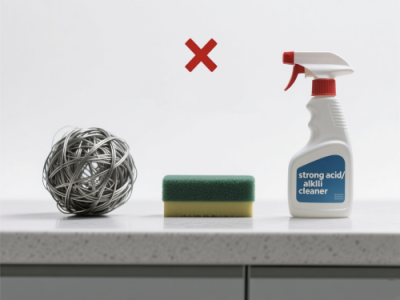 How to: Spray a small amount of a mild, non-abrasive glass cleaner or pH-neutral soap solution onto your cloth (not directly onto the metal). Wipe the stain, then thoroughly rinse the area with a water-dampened cloth and dry immediately with a dry cloth to prevent water spots.