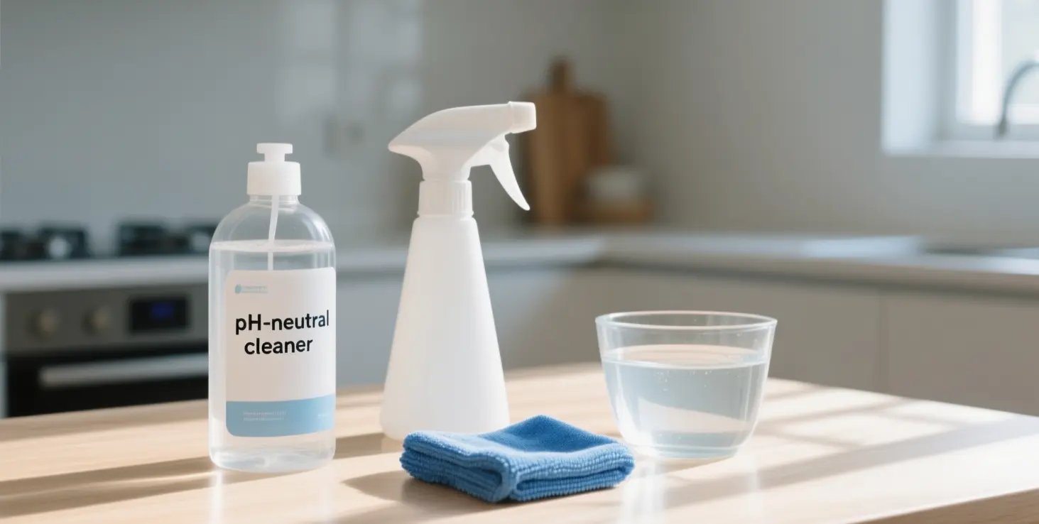 Use a pH-neutral cleaner (e.g., specialized stone cleaner) diluted with warm water according to instructions. Wipe with a microfiber mop or soft cloth.