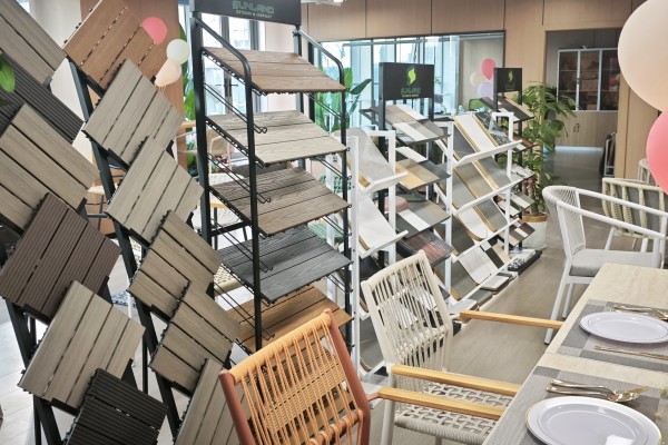 - A Key Feature: Our extensive material display shelf. Don’t just choose a product—customize it. Here, you can touch and compare samples of sintered stone, terrazzo, HPL, polywood, mosaic, melamine surfaces for table tops, and WPC decking tiles, ensuring every detail matches your vision.
