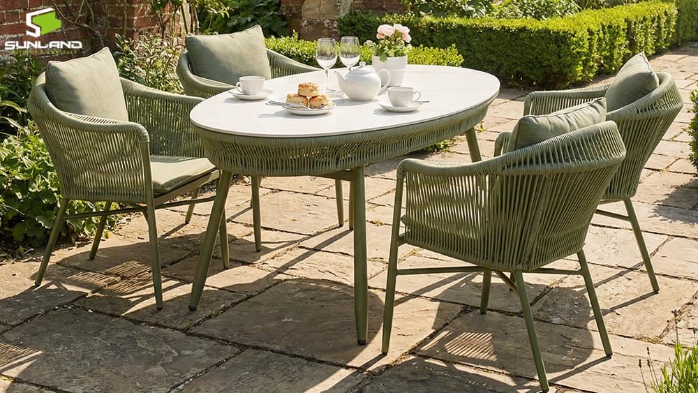 Sunland Outdoor 5pcs Alien Dining Set Powder Coating Finish Include Glossy Sintered Stone Table and Rope Woven Chair Ideal for Commercial Horeca Café SL-356WE-DS5