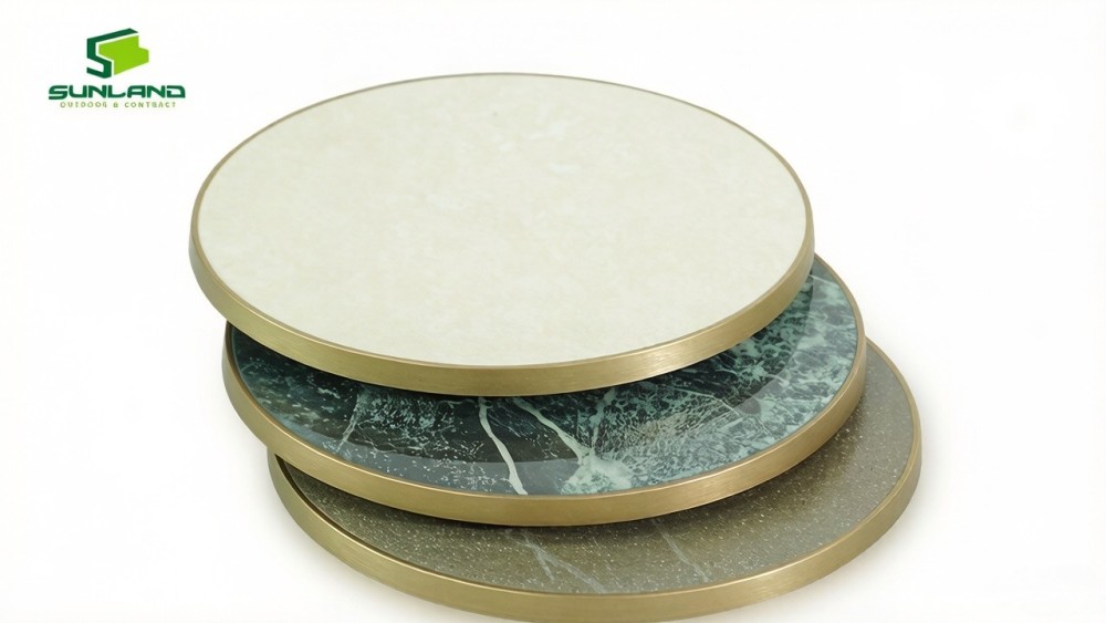 SUNLAND Round 60cm Durable Sintered Stone Table Top with Golden Flat Aluminum Edge Perfect for Commercial & Outdoor Restaurant Café SSAT-R60-T15