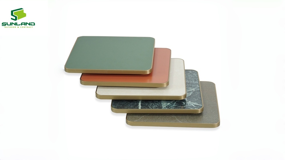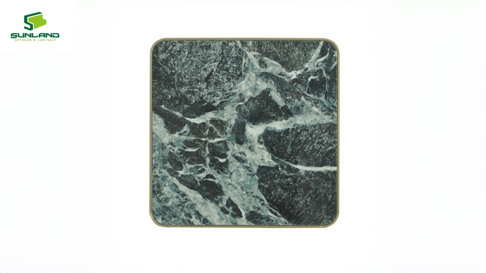 SUNLAND Easy to Clean 60x60cm Multi-Colored Sintered Stone Table Top with Golden Flat Aluminum Edge Good for Outdoor & Contract Horeca Café SSAT-S60-T15