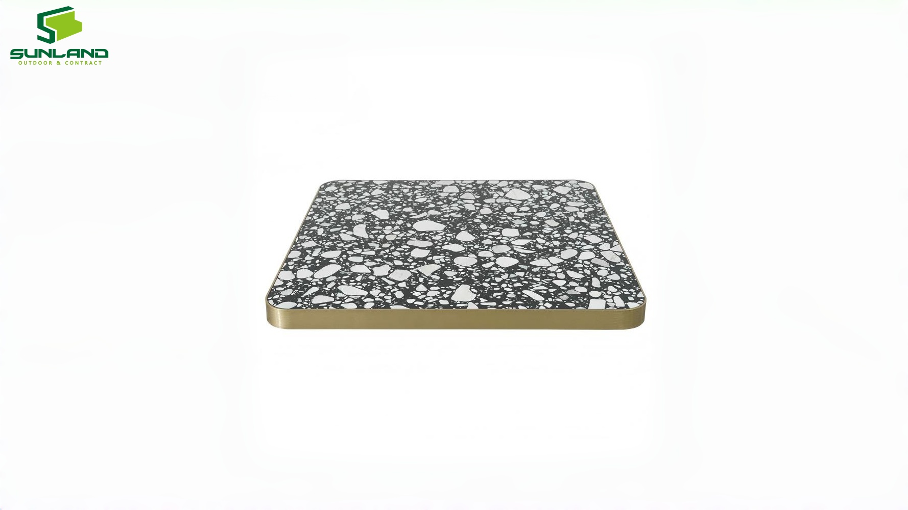 SUNLAND Easy to Clean 60x60cm Multi-Colored Sintered Stone Table Top with Golden Flat Aluminum Edge Good for Outdoor & Contract Horeca Café SSAT-S60-T15