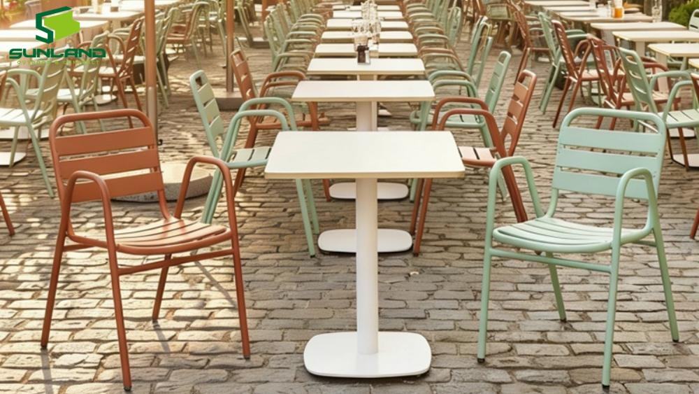 (2). Easy to clean sintered stone table top perfect for outdoor and contract cafe, hotel, horeca furniture supply from China furniture factory