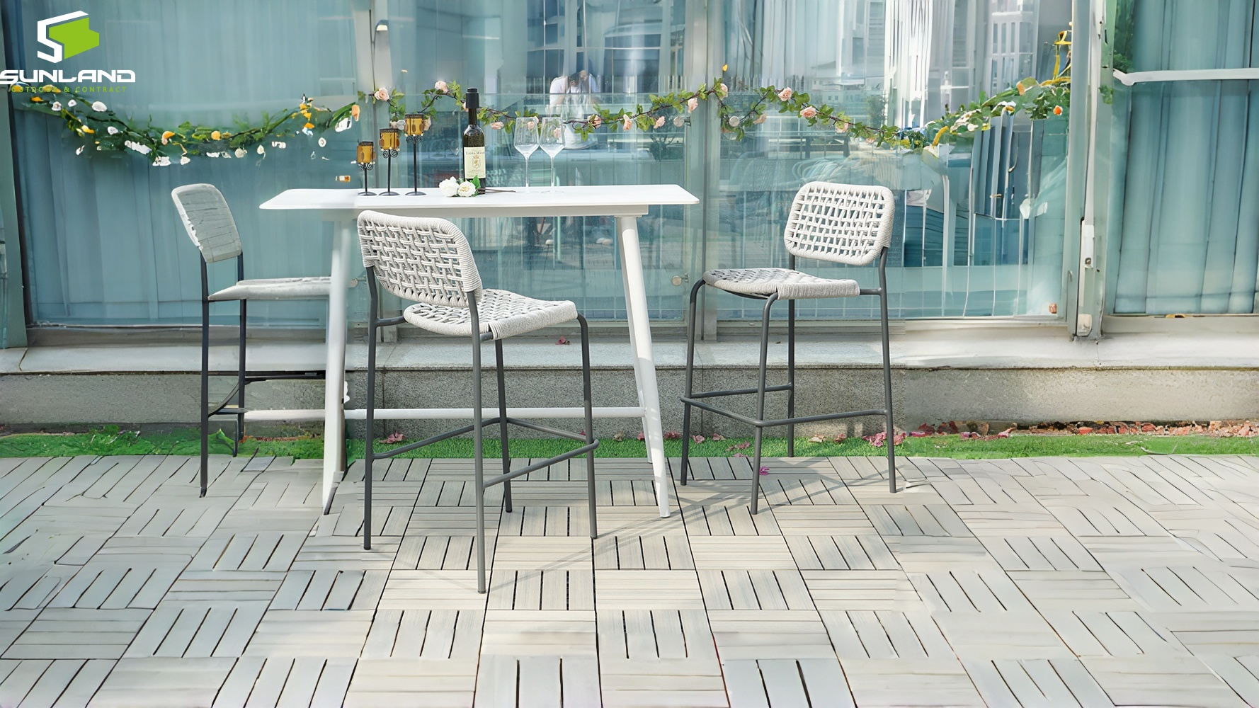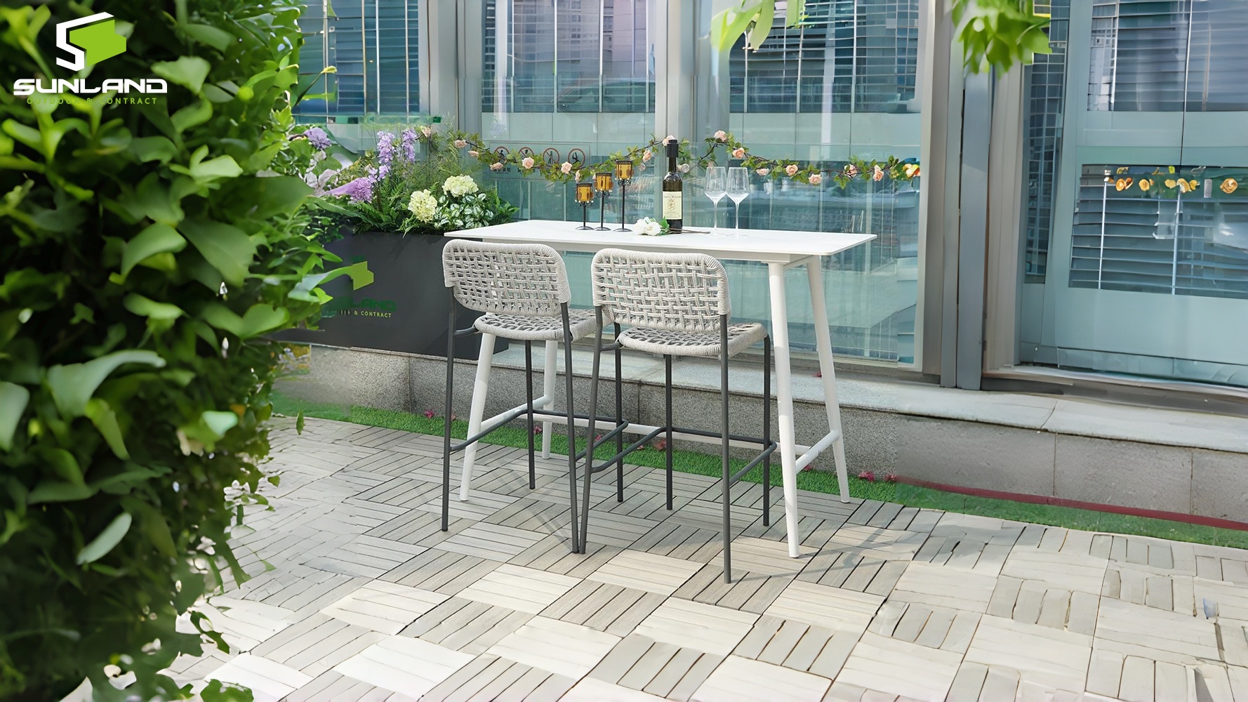 (3). Elegant aluminum structure rope-weaving bar stool set for residential outdoor garden, hotel bar and resort applications, provided by China’s top contract outdoor furniture manufacturers