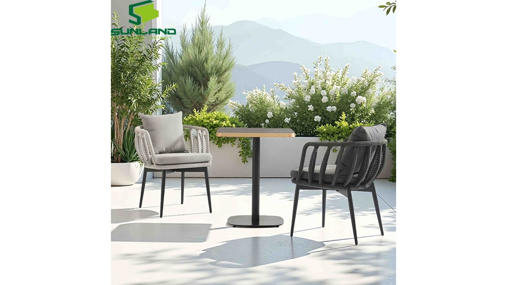 (1). Sunland new design K/D structure 6mm rope weaving dining chair for balcony patio garden furniture supply from Chinese outdoor furniture factory