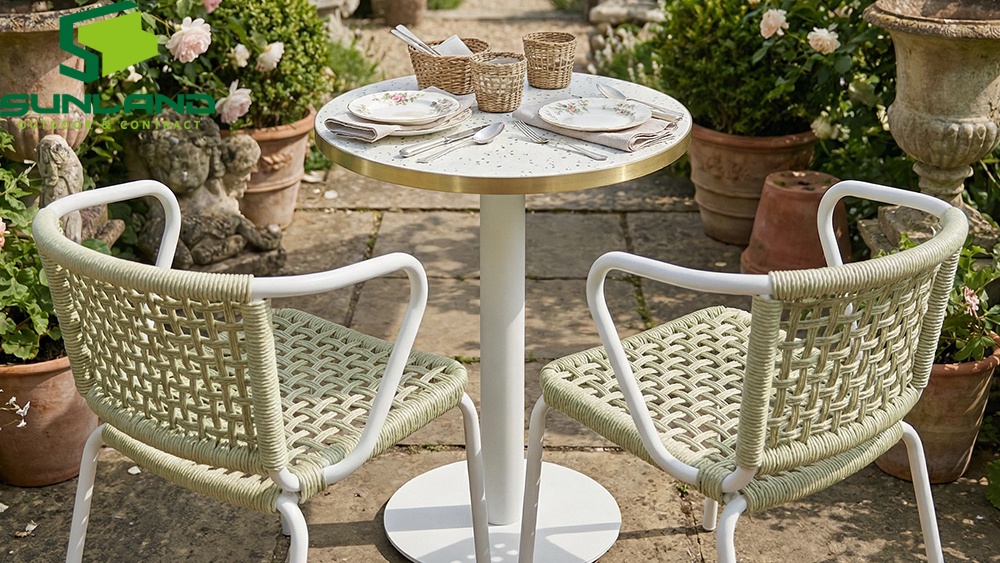 (3). Aluminium-frame, rope-weave dining collection designed for residential gardens and upscale resorts, delivered by China’s premier contract-outdoor-furniture supplier