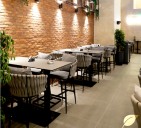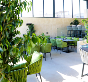 As seen in the project images, our furniture integrates seamlessly into the fabric of Shades Resto Bar. Black tables paired with the striking green chairs create a dynamic yet harmonious color palette under natural light and the industrial-style ceiling (wooden beams, metal structures, pendant lights). The brick walls, hanging greenery, and full-length glass windows are complemented by furniture that plays a key role in unifying the space—maintaining the visual openness while defining cozy dining nooks with comfortable seating.